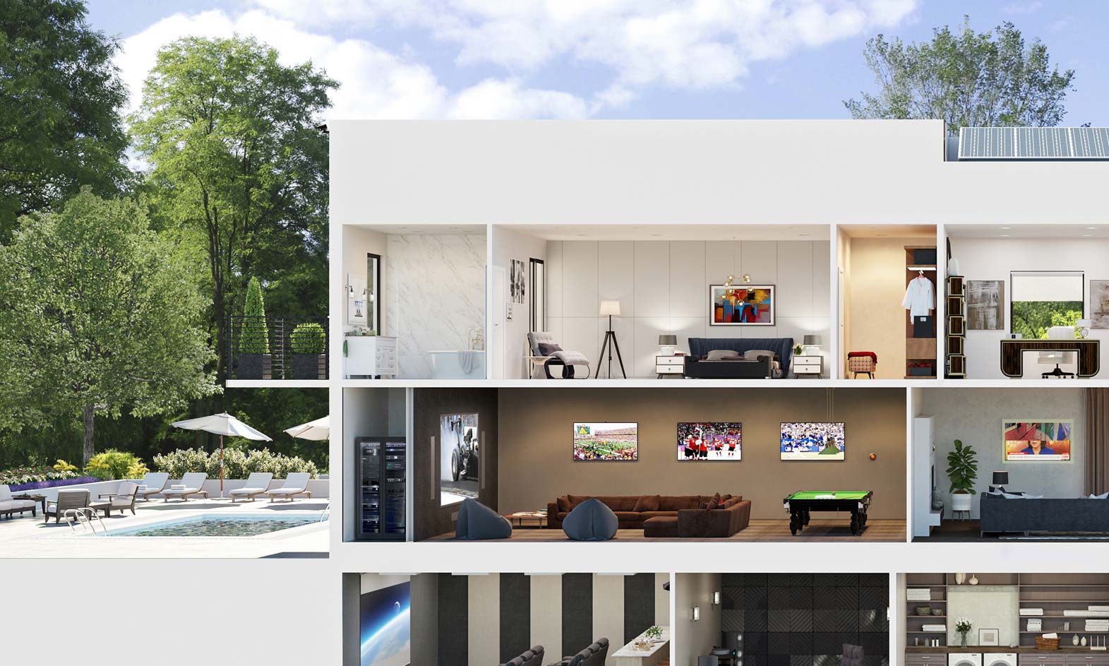 Capture the look and feel of a luxury home with this side-view dollhouse. This smart layout includes some of the more unique spaces of a high-end property, such as the dedicated listening room and underground garage.