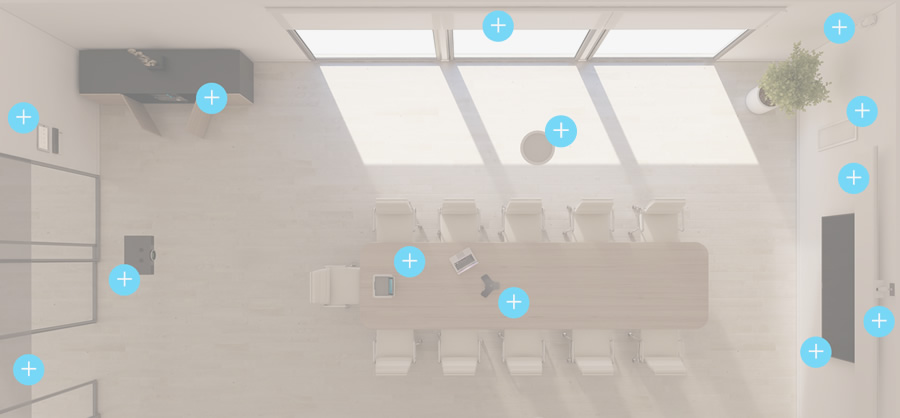 Show clients how clean and impressive smart technology can look within a modern conference room. This top-down view showcases the technologies your company offers for automating commercial environments.