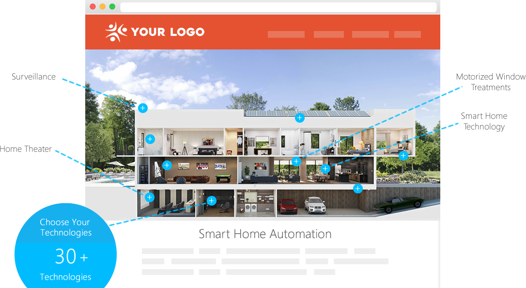 Smart Layouts are an interactive content solution designed to help you deliver a more active and educational user experience to visitors on your website. Our custom 3-D demos encourage customers to hover over and click on various technology solutions within a home or business environment, activating modules that provide information about your services. Smart Layouts are integrated into your website and responsive on all viewing devices.