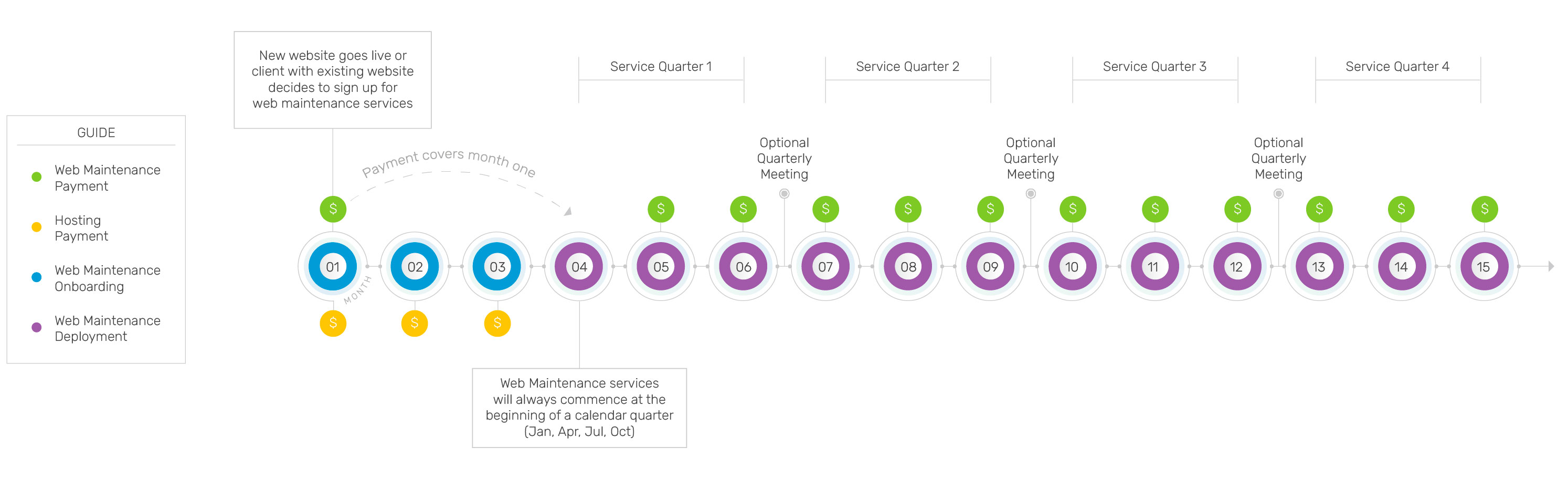 Our web maintenance services begin at the start of the next quarter after your new website goes live or when you sign up for maintenance services on your existing website. Here’s what you can expect with a yearly maintenance plan and hosting.