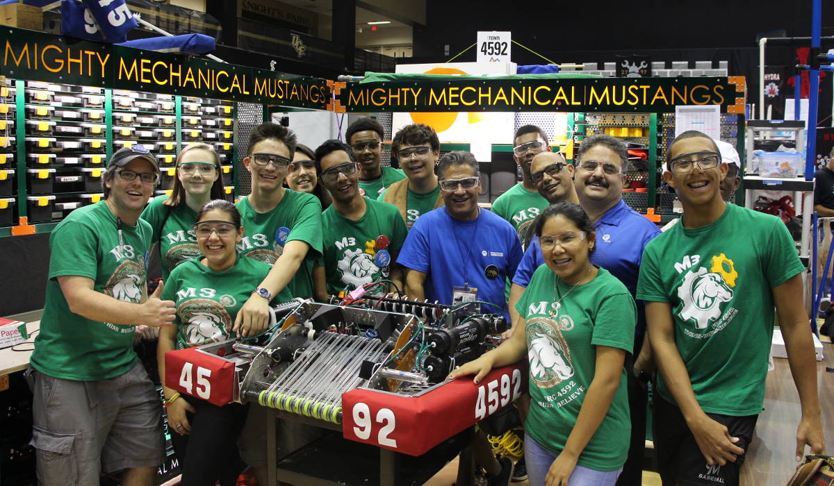 Ron Callis (far left) volunteers with The Mighty Mustangs robotics team. Robotics is a strong breeding ground for future industry technicians.
