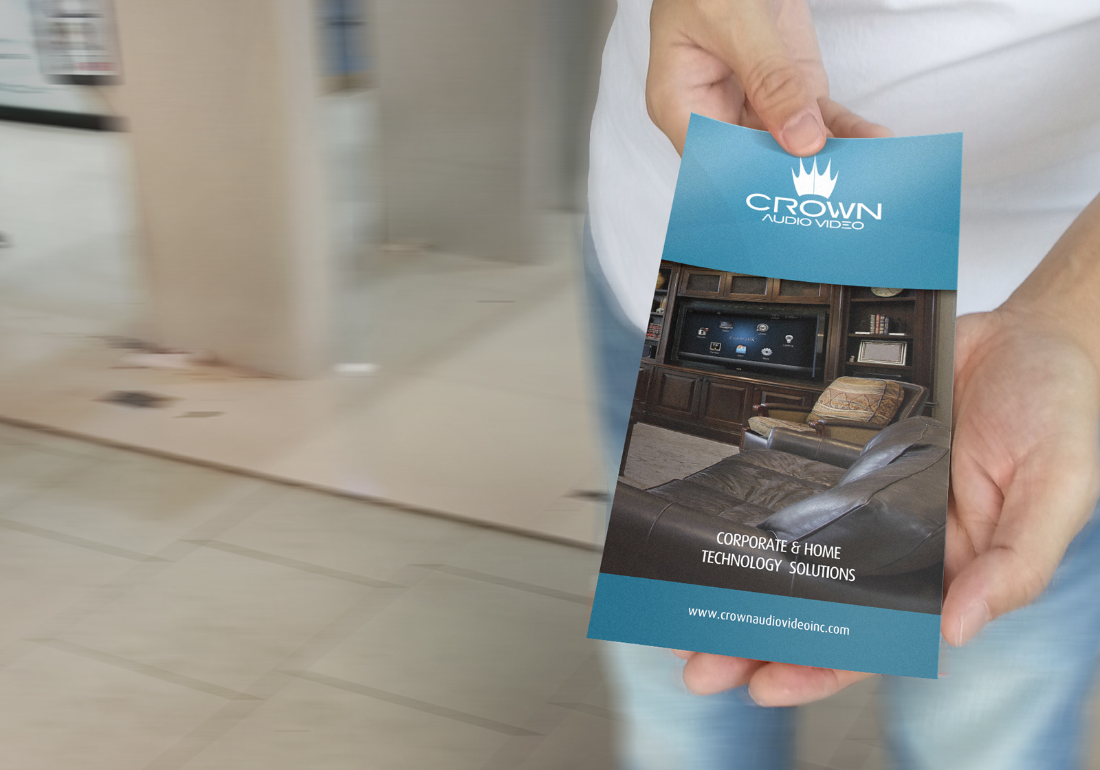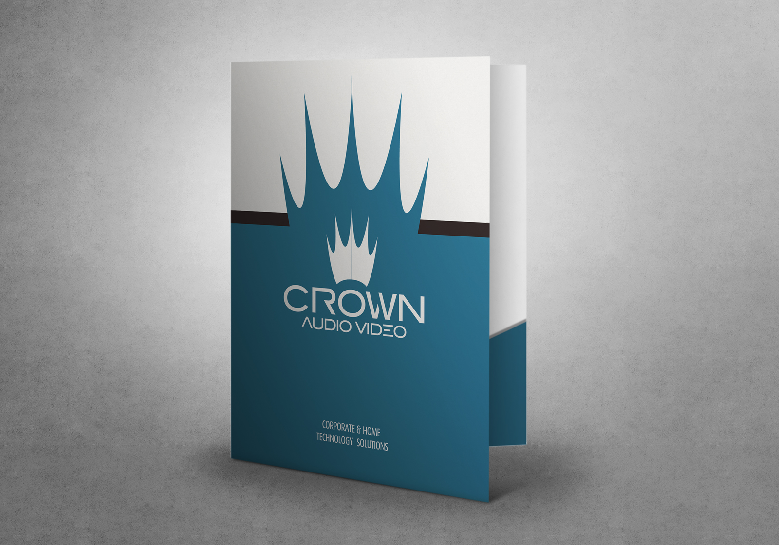 To keep consistent branding and continue to provide their clients with a high-quality experience after the initial website visit, Crown Audio Video also invested in printed marketing materials to use throughout the sales and support process. They start every sale with a professionally designed trifold brochure that highlights their services and solutions, and every bid is delivered in a branded presentation folder.
