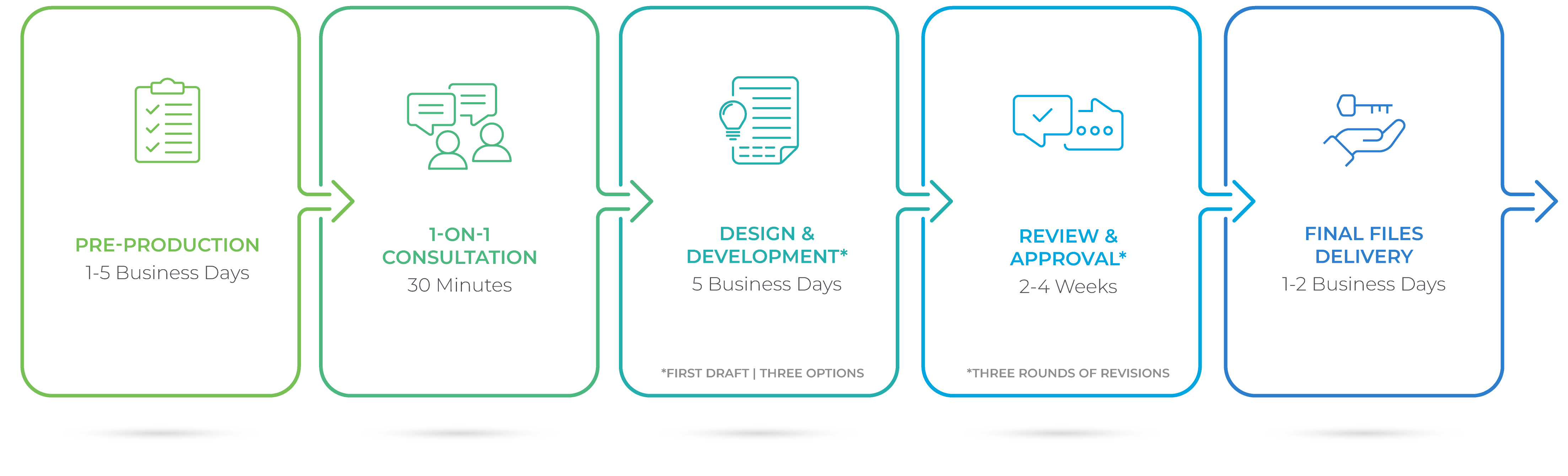After you sign up for one of our logo development services, our graphic designer will send you a logo questionnaire to gather some basic information about your business and what you’re looking for in a logo. Next, you’ll meet with the designer to discuss your logo project, expectations, and timelines. Then, our designer will get to work creating anywhere from 1-5 logo options (depending on the package you purchase) for you to review and provide feedback or revisions. You’ll receive 1-5 rounds of revisions. If you request revisions beyond your package scope, you may purchase them for an additional fee on an hourly basis. Once you approve the final design, we’ll send you the design files for you to keep and use.